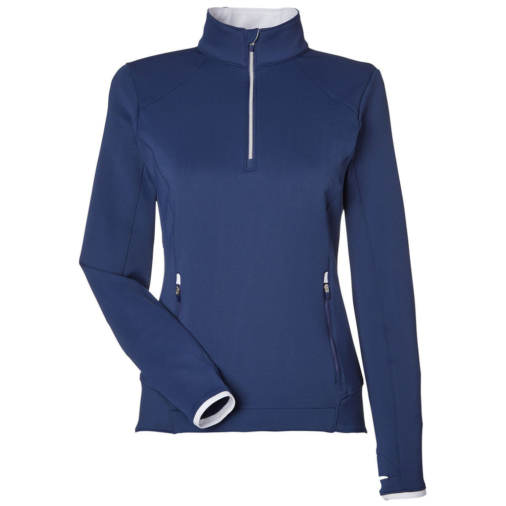 Zero Restriction Women's Storm Sofia Quarter-Zip Pullover with a custom logo is a must-have who want to look great while enjoying the day outdoors. This sleek pullover is perfect for working out, heading to yoga, or just walking through the woods. The back vent offers breathability and thumb holes make this ideal for jogging.Highlights