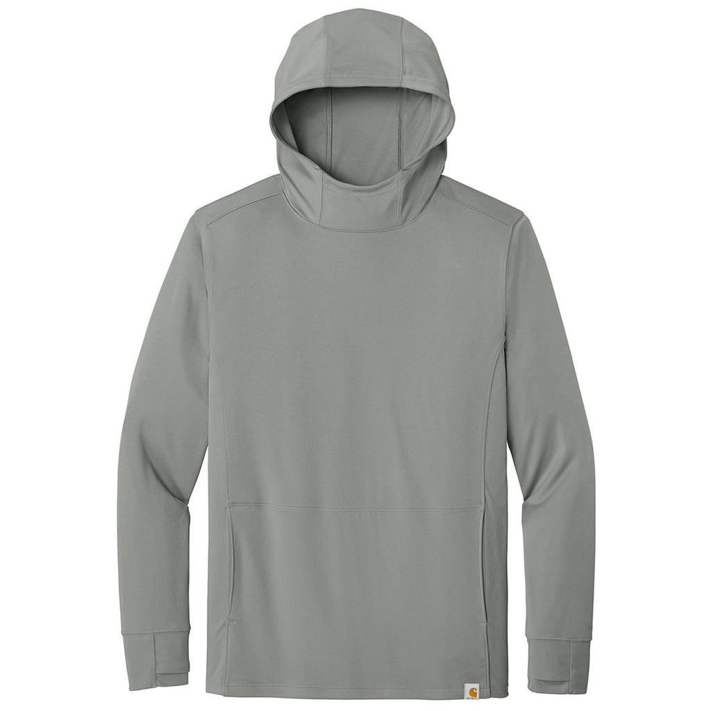 Carhartt Men's Asphalt Grey Force Sun Defender Long Sleeve Hooded T-Shirt with a custom design offers built-in sun protection with moisture-wicking technology. Designed to keep you cool and shielded, this shirt is ideal for outdoor work or recreational activities. The hood provides extra coverage, making it an excellent choice for those who need reliable UV defense and comfort on long days outside.