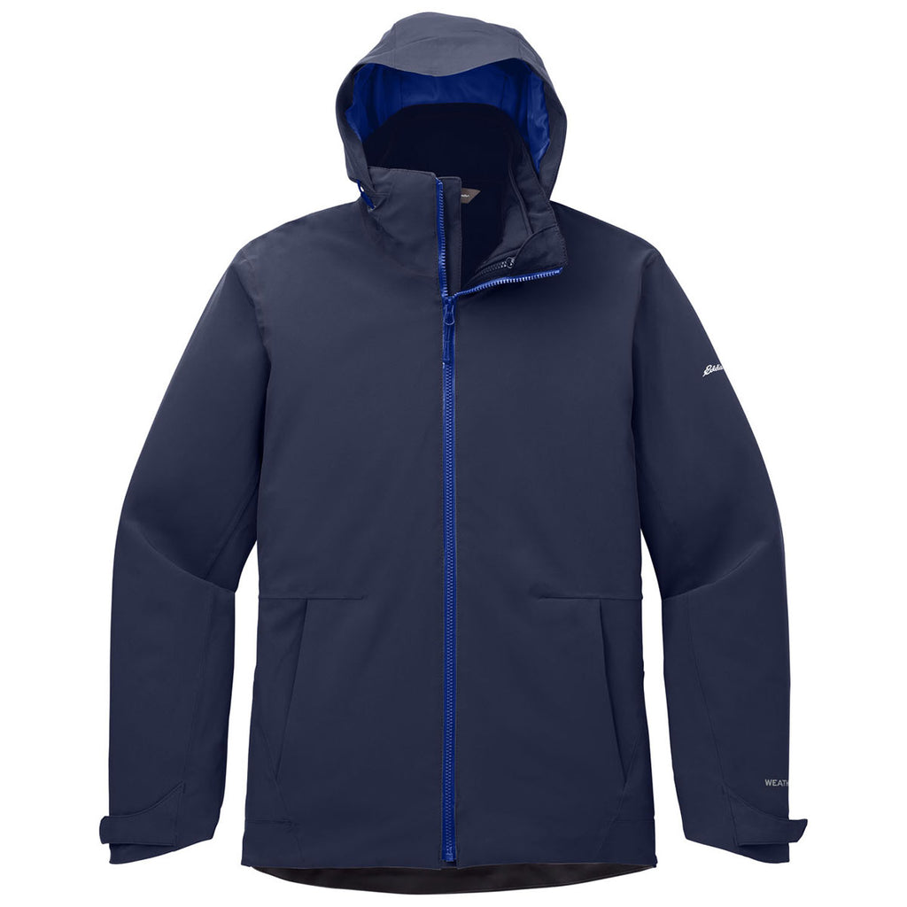 Adapt to life with a custom embroidery Eddie Bauer Men's River Blue/Cobalt Blue WeatherEdge 3-in-1 Jacket. Engineered to adapt to weather conditions of all types, this 3-in-1 system is seam sealed throughout to be waterproof, yet breathable. An inner soft shell provides warmth and water repellant technology keep you dry. This jacket is ready for the slopes, but can be-Zipped apart and worn as pieces. Add a company logo to the jacket to give as employee gifts that can be enjoyed year round. An adjustable hood with locking drawcord, adjustable cuffs, and-Zippered pockets create a purposeful jacket that looks great.