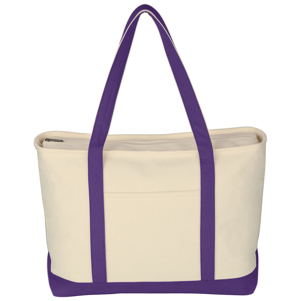 Enjoy the Hit Natural/Purple Large Starboard Cotton Canvas Tote Bag with a custom logo. This neutral color bag has a bottom panel and shoulder straps in several color options to fit your needs. The ideal option for the beach, park, or road trip, the roomy tote zips closed for convenience. Give as a gift or add to your logoed items for sale.