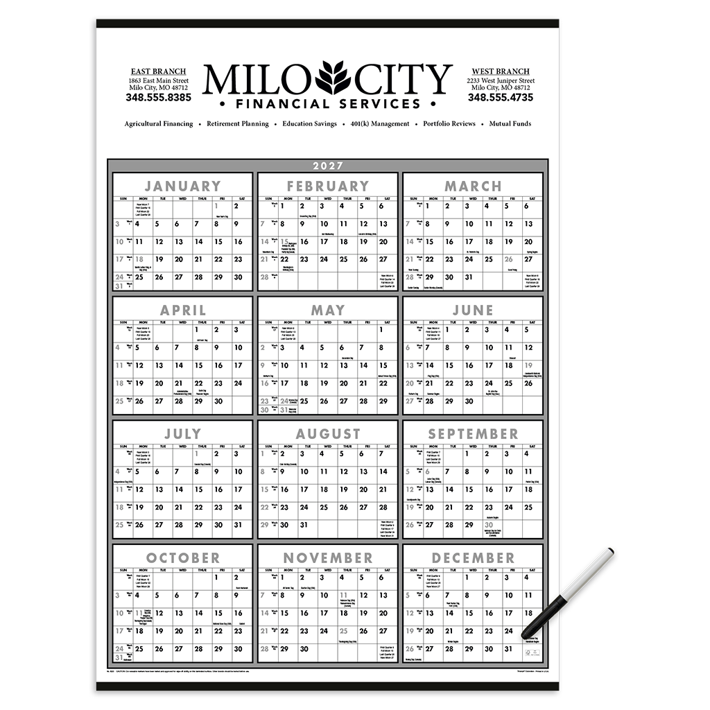 Add your logo to the Triumph Calendars Black & White Black & White Span-A-Year Laminated calendar so users see it daily when they check their schedule. This dry-erase type calendar allows you to easily add or erase appointments as needed. Each morning, check out the schedule and get moving. Perfect for home, work, or school. Order today.The minimum order for this product is 100 pieces.
