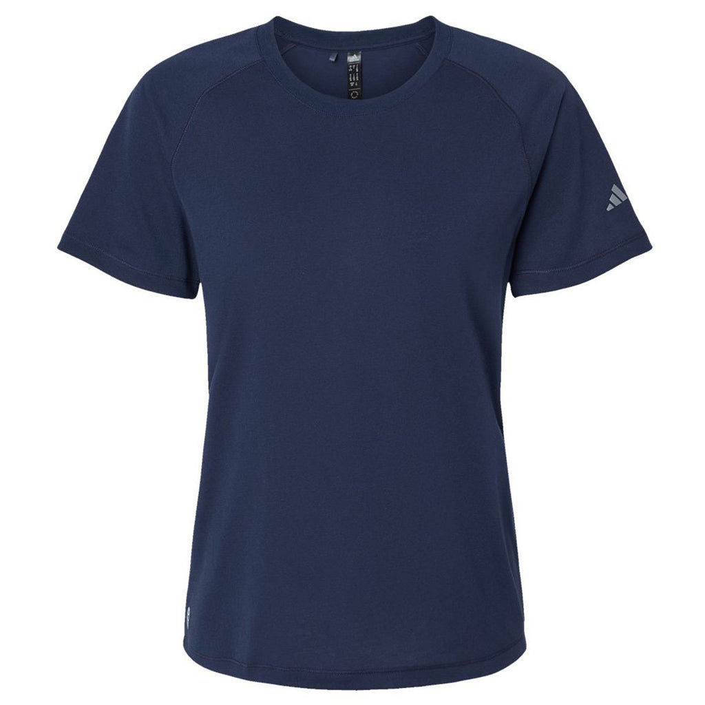 The Adidas Women's Collegiate Navy Blended T-Shirt with a custom logo is a must-have for those who like to relax and have a little fun. The regular-fitting tee is highly versatile and looks great during almost any activity. Made of recycled polyester and cotton, the sustainable tee can serve as brand awareness, team gear, or daily wear with ease.This product cannot ship outside of the United States