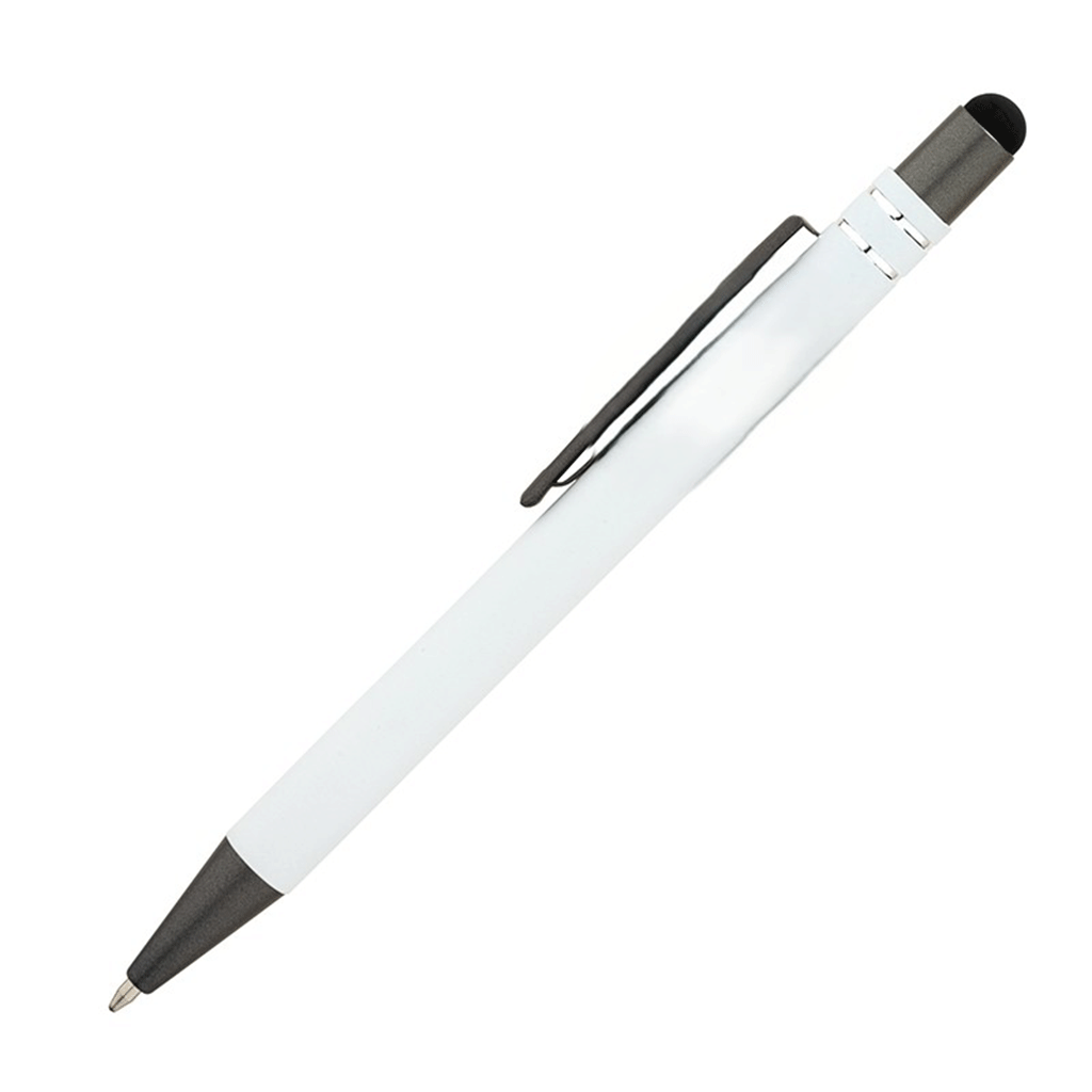 The White Silvana Soft-Touch Ballpoint Pen with Stylus is a great gift for your new hires. It has black ink, a plunge-action mechanism, chrome trims, and an aluminum body with a soft-touch rubberized finish. This pen has a pocket clip and a capacitive stylus for touch screen devices. It's ideal for notetaking and business meetings.The minimum order for this product is 500 pieces.