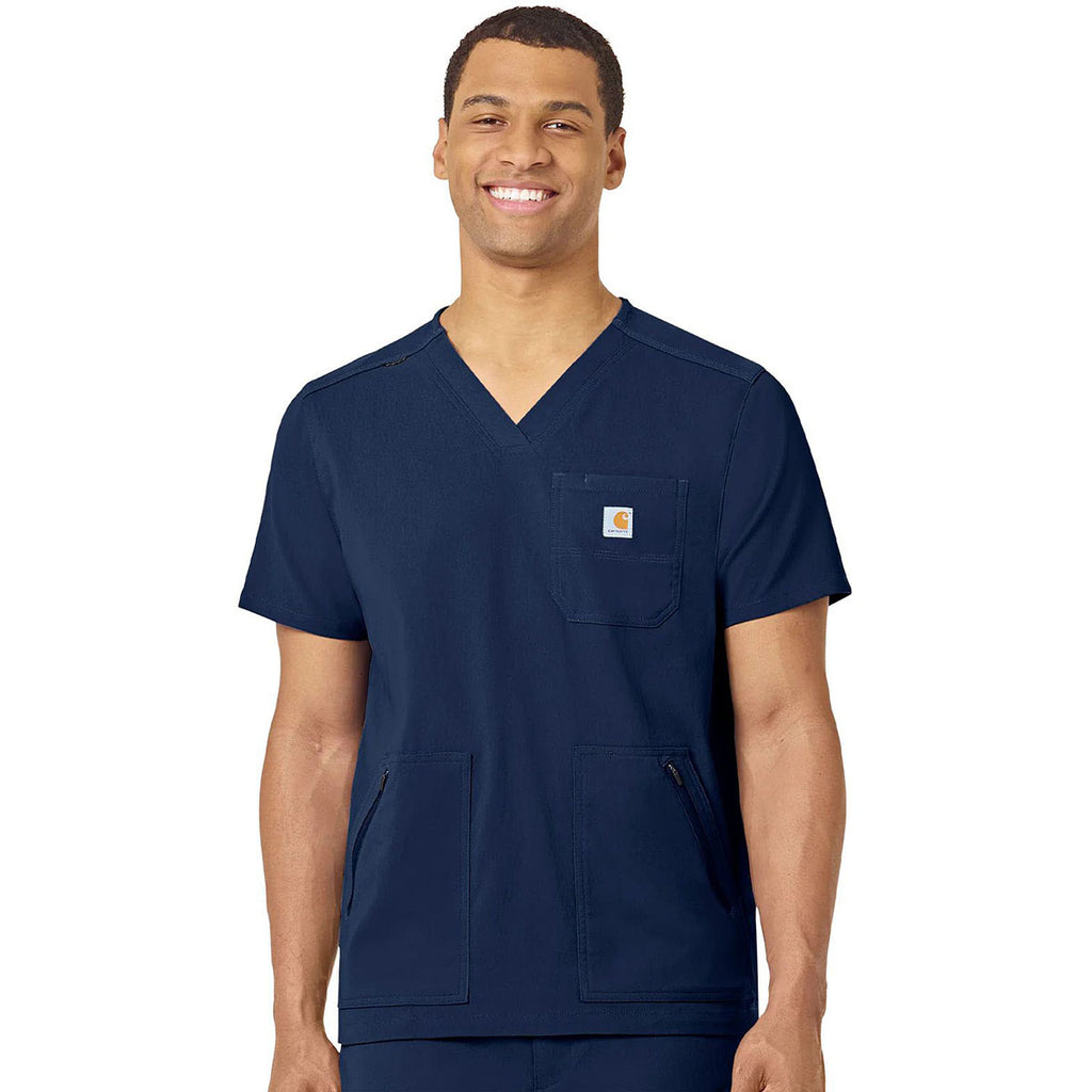 Carhartt Men's Navy Modern Fit 5-Pocket V-Neck Top with a custom logo is a must-have for those who work in the medical industry, as vets, as techs, and much more. The durable top has stretch technology, water-repellency, and a chest pocket. Side vents keep you cool and allow you freedom of range of movement that is needed each day.Highlights
