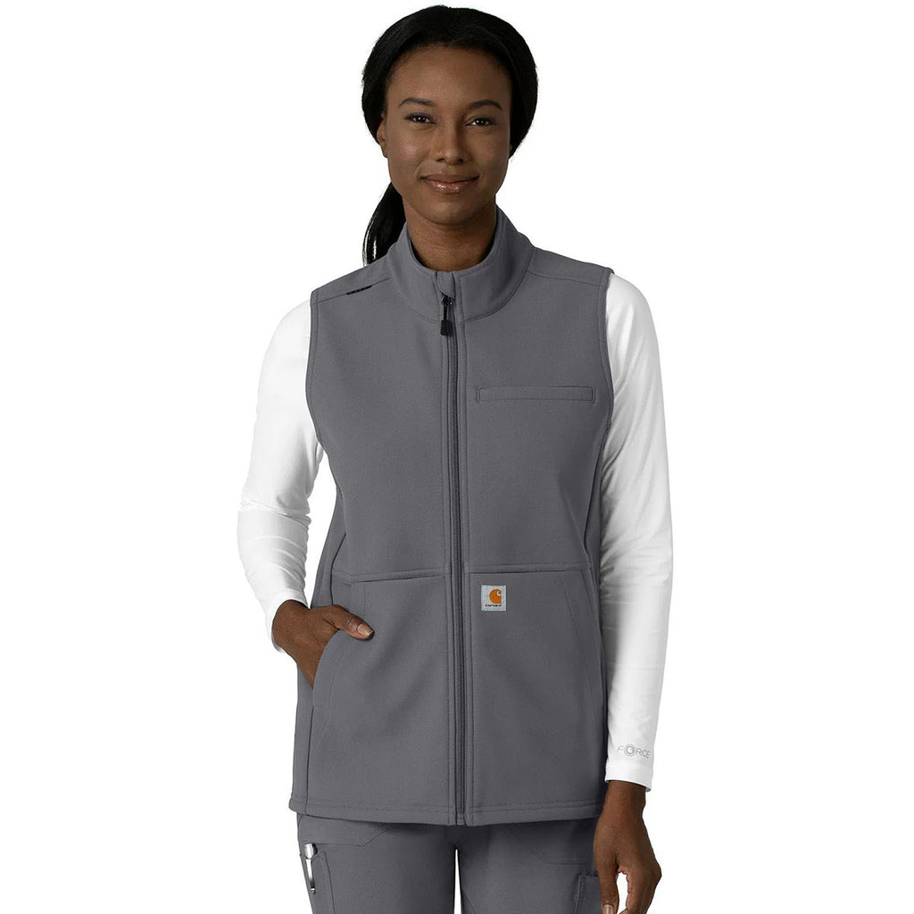 Stay warm in a custom Carhartt Women's Pewter Four-Pocket Bonded Fleece Vest with full-front zip styling. This gorgeous, versatile vest is essential between seasons when the weather is questionable. Easily display your badge, keep important items secure in the zippered pockets, and go about your day with ease. Perfect for nurses, in-home care, or those who work in client's homes.Corresponding Men's Style: Carhartt Men's Pewter Four-Pocket Bonded Fleece Vest