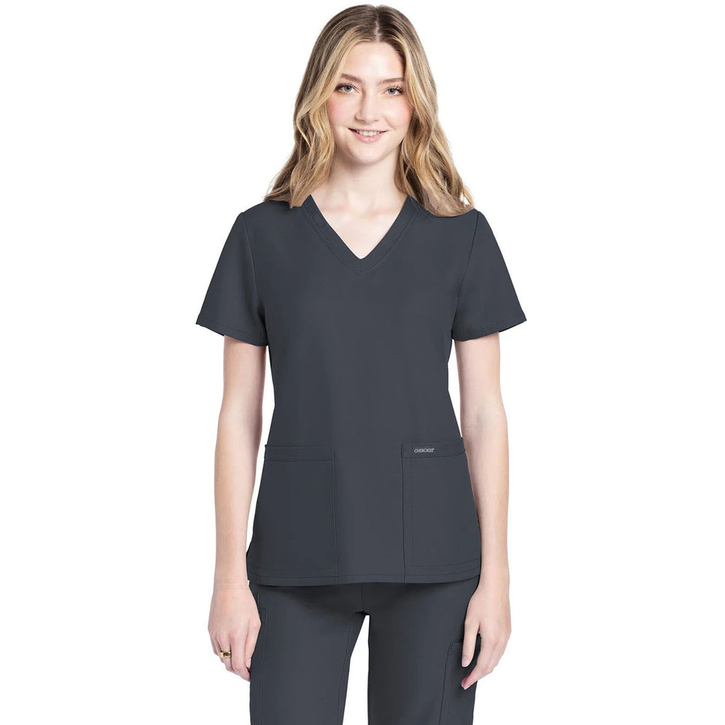 Cherokee Women's Pewter 2-Pocket V-Neck Top with a corporate logo is a must-have for those in multiple professions. Perfect for those in the medical field, those who work with animals, or those who provide in-home care, this comfortable option has side vents, antimicrobial and moisture-wicking technology, and roomy patch pockets.