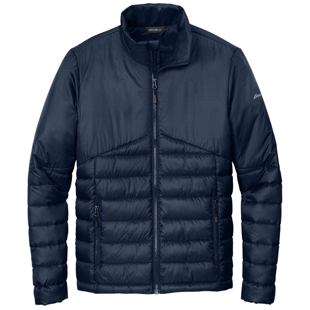 Eddie Bauer Men's River Blue Navy Quilted Jacket with a custom logo is ideal for those who work or play in the Great Outdoors. The quilted jacket is warm without being bulky and maximized to keep you warm while building snowmen, hitting a black diamond slope, or watching an outdoor game with friends. Place an order today.