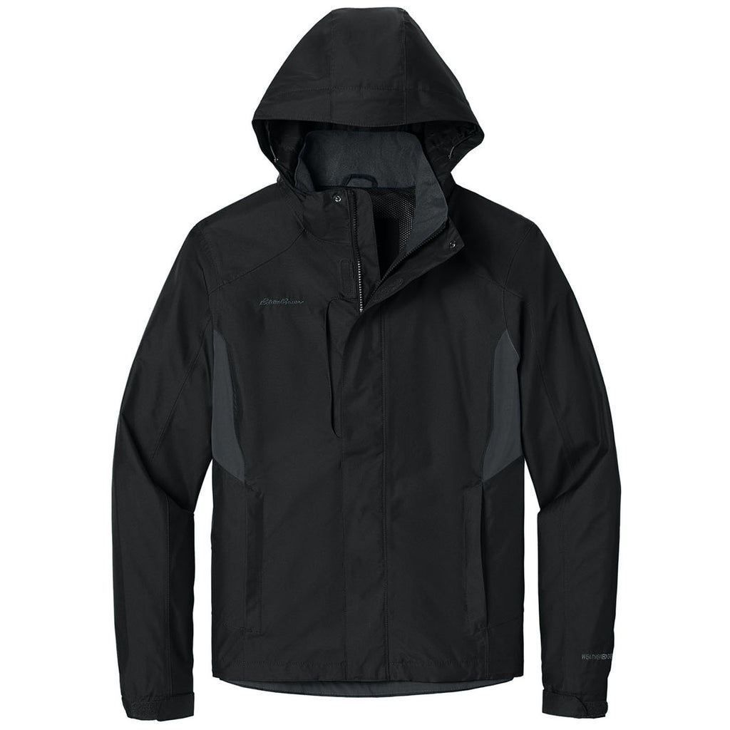 Serious people don't let a little rain stop them from getting work done. The Eddie Bauer Men's Black/Steel Grey Rain Jacket is a serious rain jacket for those same serious people. The 5000MM waterproof rating ensures that you'll keep the moisture locked out of your upper body. The storm flap with hook and loop closures will ensure that the jacket's own openings won't let the rain in, either. The 100% polyester dobby shell, the mesh body lining, and the 100% nylon accents are all perfect rain-ready gear; all that's missing is your own company logo on the front.