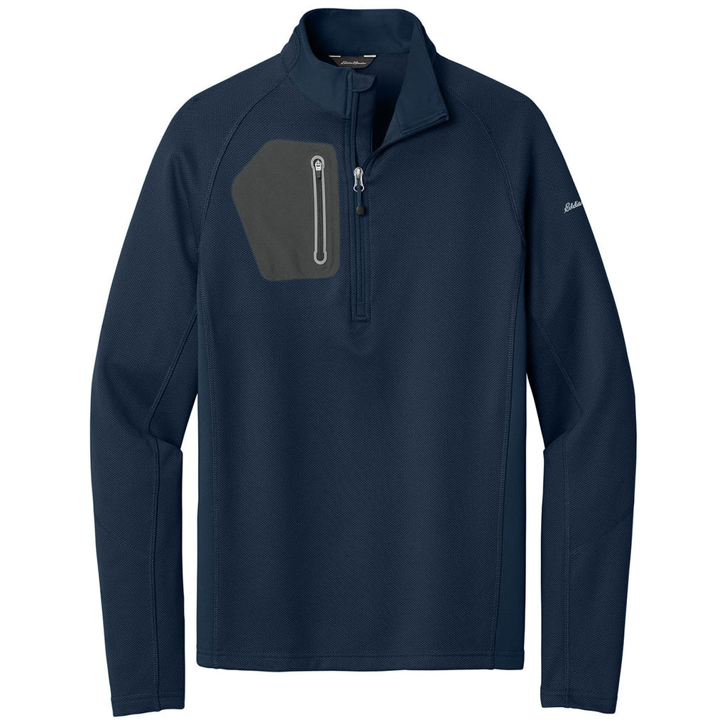 Want a little bit of contrast from the usual fleece jacket something that says you're conventional on the surface but just a little bit different? Then you've come to the right place. The Eddie Bauer Men's River Blue Half Zip Performance Fleece Jacket has all of the usual things that makes Eddie Bauer fleece so great: a great fabric blend, reverse coil zipper, open cuffs, etc. But the contrast pocket in front really does a lot to elevate this piece into something else entirely. Simply add your custom logo to make this piece your piece, as well as a great piece of corporate swag that people will love wearing throughout the cooler months.