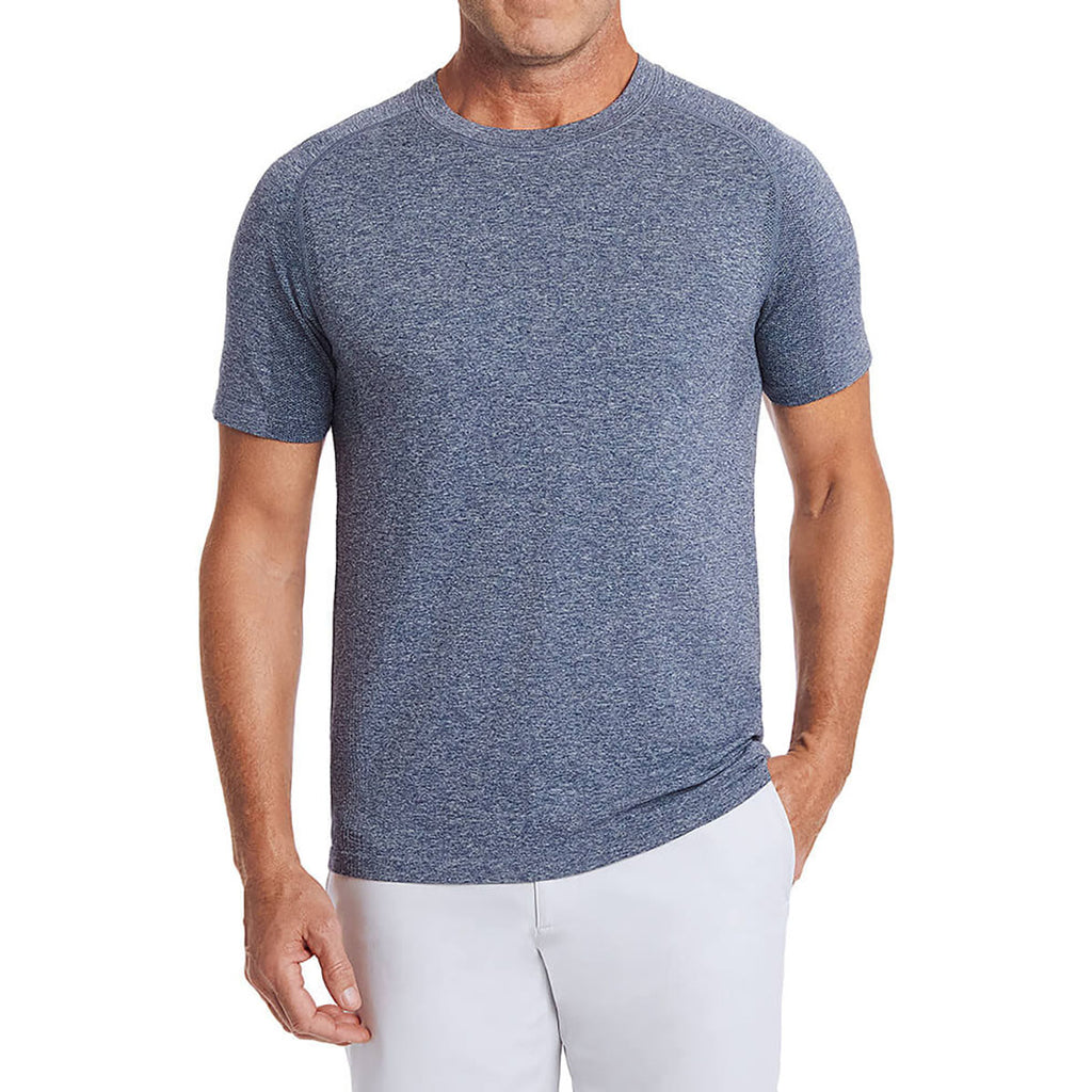 Custom-engineered for movement, the Holderness & Bourne Men's Heathered Navy The Pickett Performance T-Shirt offers breathable, quick-dry comfort with a refined athletic look. Its heathered fabric elevates everyday wear while moisture-wicking technology keeps you cool. Ideal for workouts or layering under casual jackets, this tee combines function with subtle sophistication.Highlights