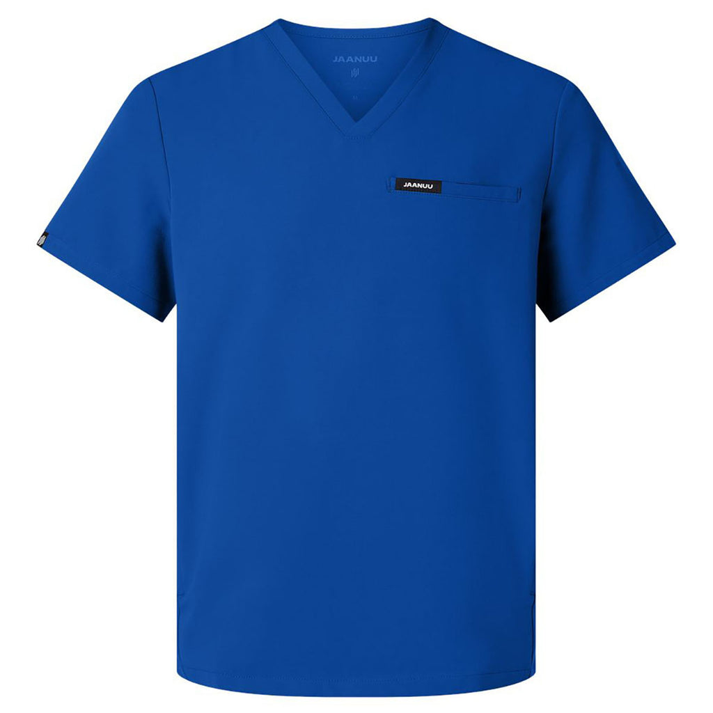 Jaanuu Men's Royal Blue Platt 3-Pocket Scrub V-Neck Top with a custom logo creates an easy to wear option for all your scrub top needs. Made of a revolutionary four-way stretch fabric with a classic fit, this top is antimicrobial, wrinkle and fade resistant, and has moisture management properties so you will look and feel great while healing the sick or going about your day.Highlights