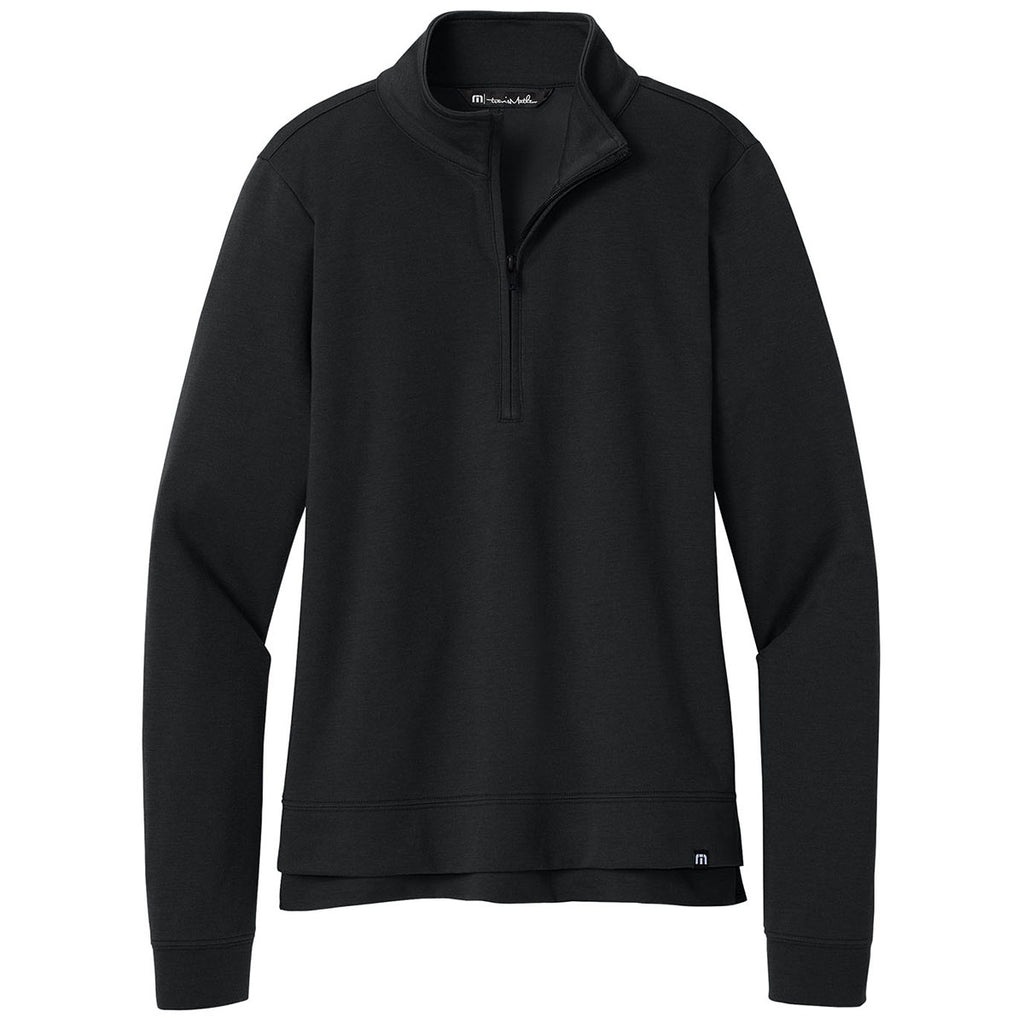 TravisMathew Women's Black Coveside 1/2-Zip with a custom logo brings together comfort and style in a versatile design. The moisture-wicking fabric keeps you dry and comfortable, while the 1/2-zip allows easy layering. Ideal for outdoor activities or casual days, this pullover offers a polished yet relaxed look that suits both athletic pursuits and weekend outings.
