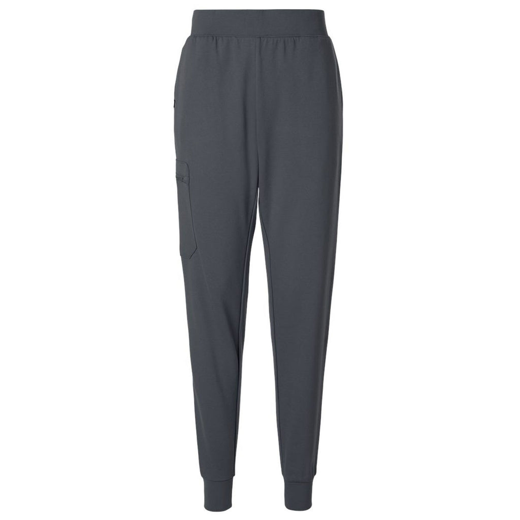Jaanuu Women's Carbon Grey Rubi Ultrasoft Scrub Joggers with custom embroidery make a great gift or corporate uniform for those in the healthcare or health and wellness industries. These slim fitting joggers have four-way stretch, moisture management properties, and several pockets for convenience as you go about your day.